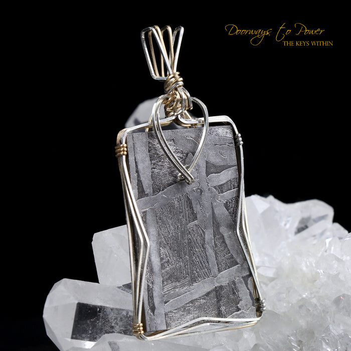 Amazing Ultra Rare Gibeon Meteorite, modern cutting, clean design wrapped in 14k gold. The Widmanstatten crystalized pattern of the nickel-iron meteorite is especially distinct in this powerful other worldly piece.