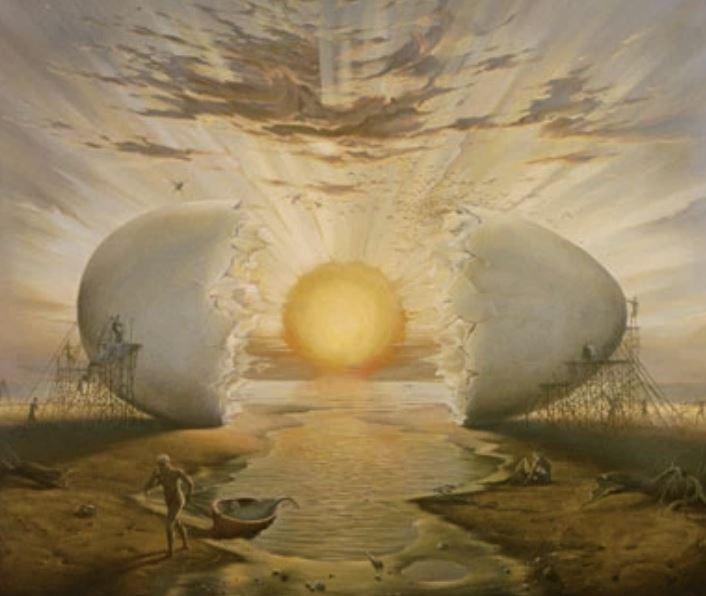 The ancients imagined that the universe was hatched from a primordial egg. The egg has captivated humans and it has become a symbol of life, fertility, generation and re-generation. To the Alchemists it was analoguous to the Macrocosm, the universe.