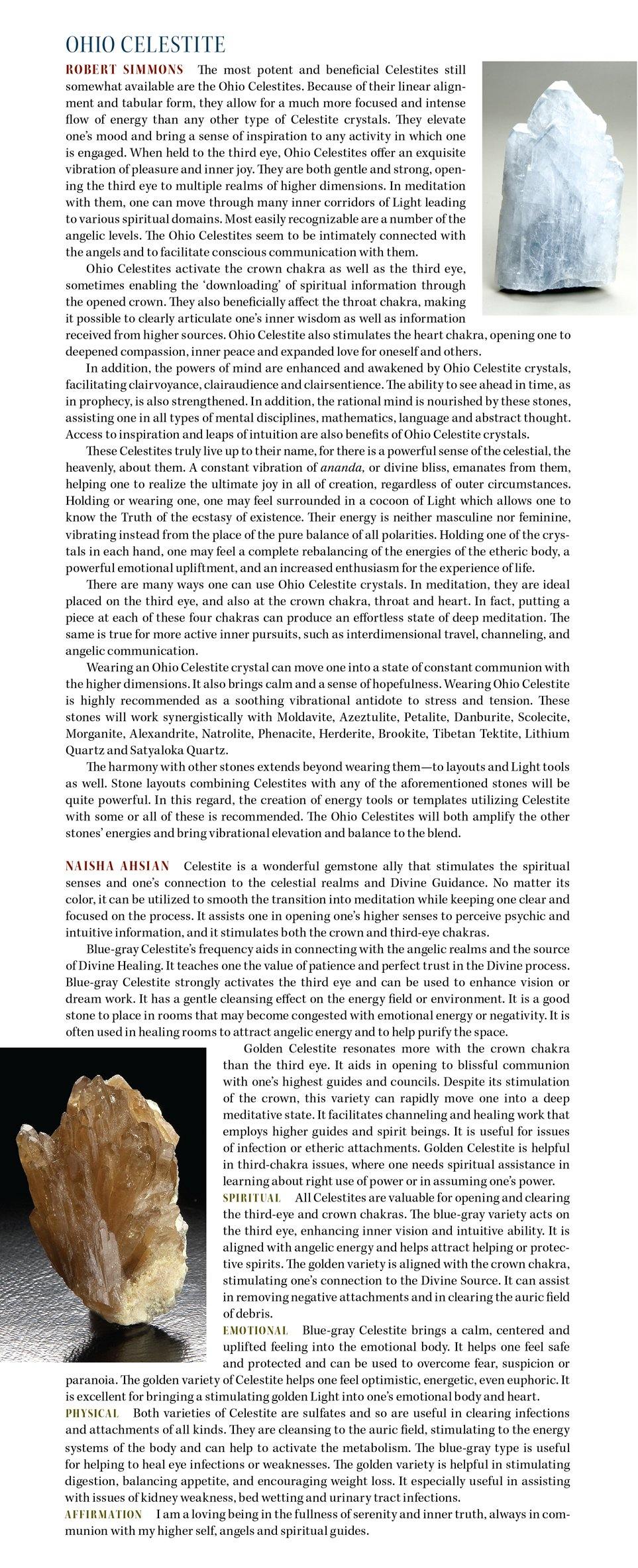 A constant vibration of Ananda , or divine bliss, emanates from them, helping one to realize ultimate joy in all of creation, regardless of outer circumstances. Plus much more. The most potent and beneficial Celestite's still somewhat available are the Ohio Celestites. Because of their liner alignment and tabular form, they allow for much more focused and intense flow of energy than any other Celestite crystals.
