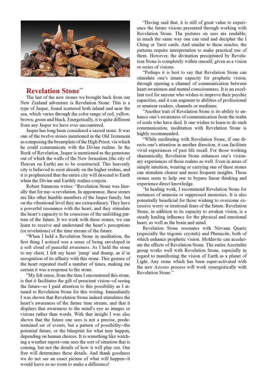 Revelation Stone has a powerful resonance with the heart, and stimulates the heart’s consciousness of the unfolding pattern of the future. It displays that awareness to the mind’s eye as images or visions rather than words. The future one sees is not a precise, predetermined set of events, but a pattern of possibility—the potential future, or the blueprint for what may happen, depending on human choices.
