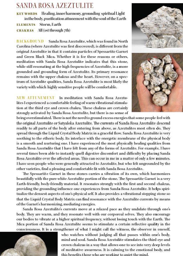 "Sanda Rosa Azeztulite, perhaps because of its mica and garnet inclusions, is more grounded than other forms of Azeztulite, and is therefore easier for some highly sensitive people to work with."