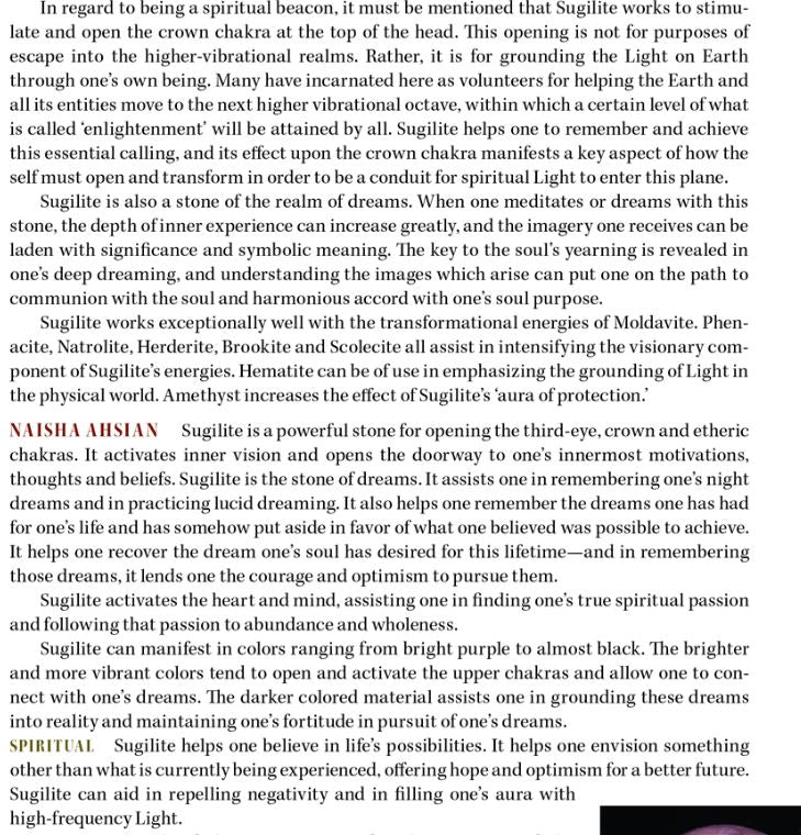 Sugilite is perhaps the most powerful stone for calling in the violet flame of purification. It tends to 'burn away' the gray spots in the auric field, removing negative attachments and karmic influences.