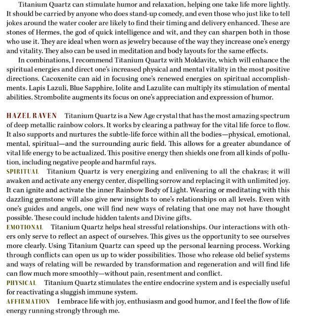 Stimulates the third-eye intensely. Healing purpose: Intuitive sources say that Titanium Quartz is very energizing on all levels, and that it can awaken all seven chakras, the energy centers of the body. It is said to increase zest and enjoyment of life, and to dispel sadness.
