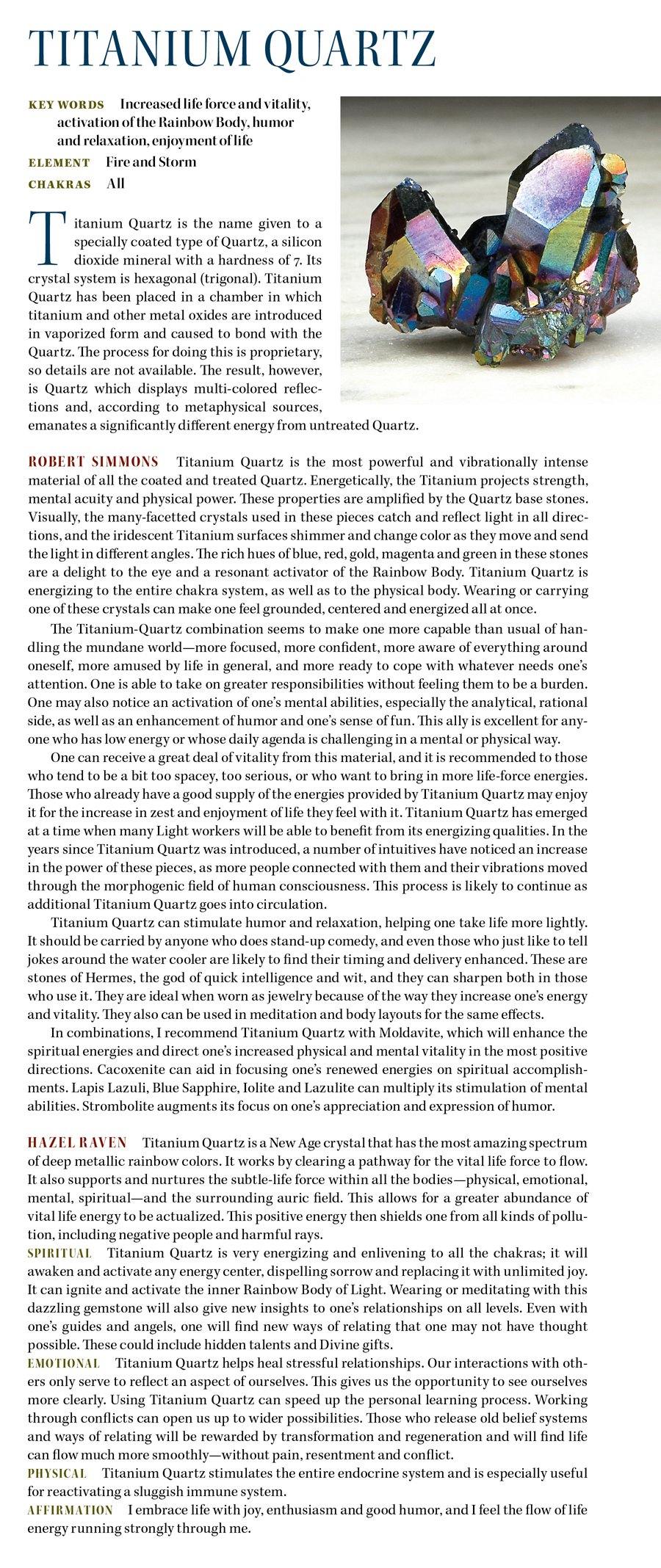 Stimulates the third-eye intensely. Healing purpose: Intuitive sources say that Titanium Quartz is very energizing on all levels, and that it can awaken all seven chakras, the energy centers of the body. It is said to increase zest and enjoyment of life, and to dispel sadness.